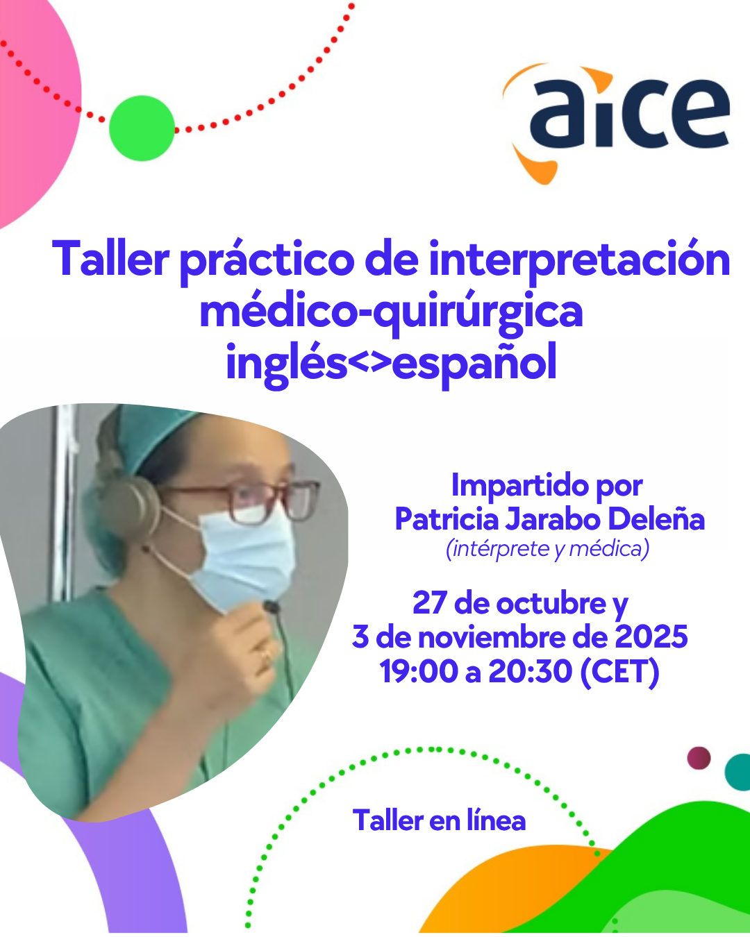 Descripción: Esta iniciativa ofrece una formación única en interpretación médica inglés<>español de la mano de una intérprete que además es médica: una combinación de valor incalculable. Es una oportunidad para resolver dudas, adquirir automatismos, superar escollos habituales y reunir una auténtica caja de herramientas práctica. Aunque está pensada para la combinación inglés<>español, también resultará provechosa para quienes trabajen con el español y otros idiomas. Una experiencia formativa imprescindible para crecer en un campo tan relevante como apasionante. De la mano de Patricia Jarabo Deleña (médica y miembro de AICE).